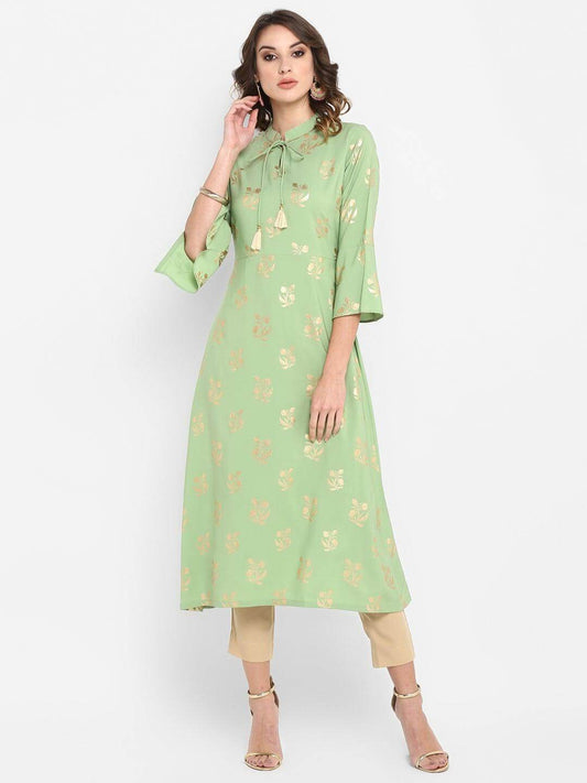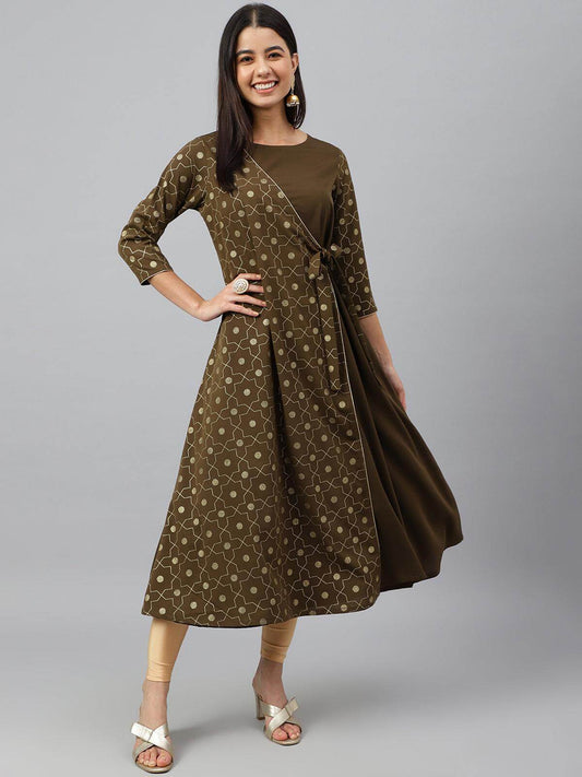 Mehendi Green Crepe Foil Print Angrakha Kurta