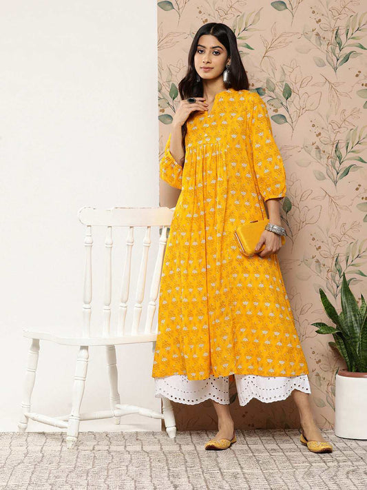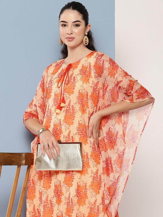 Orange Chiffon Lurex Floral Printed Kaftan Kurta