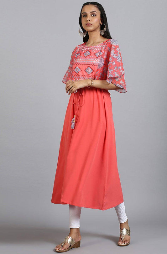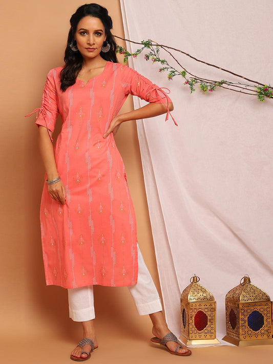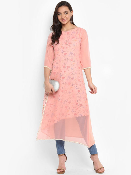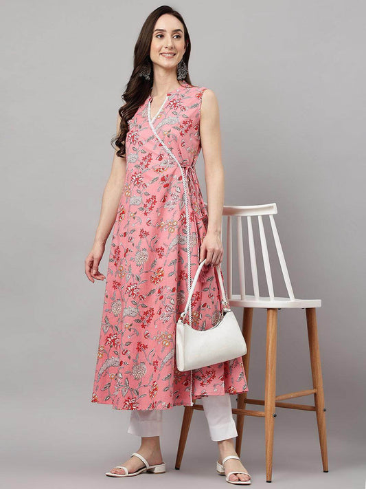 Women's Pink Cotton Floral Print Angrakha Kurta