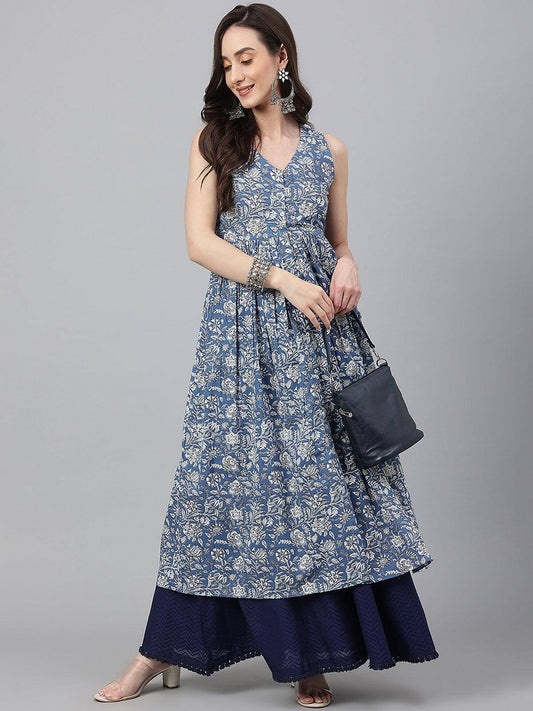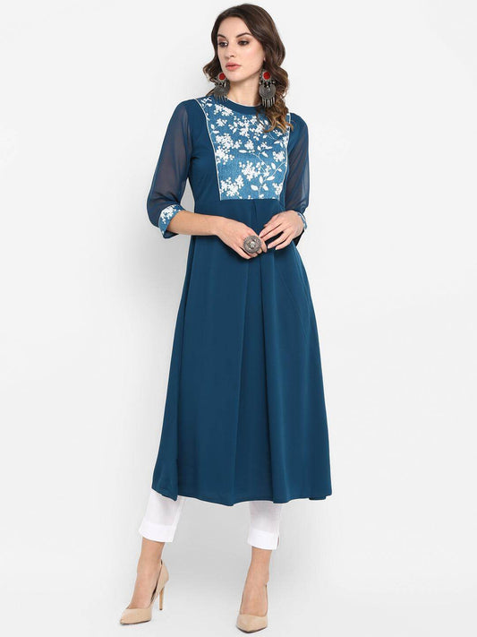 Teal Blue Poly Crepe Floral Print A-line Kurta