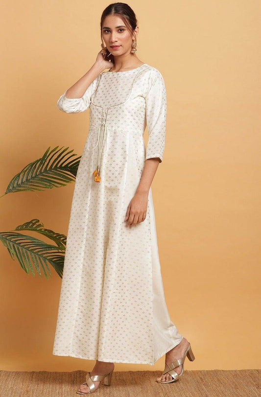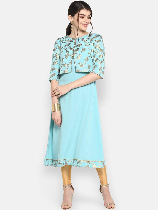 Aqua Blue Poly Crepe Gold Print A-Line With Attached Jacket Kurta
