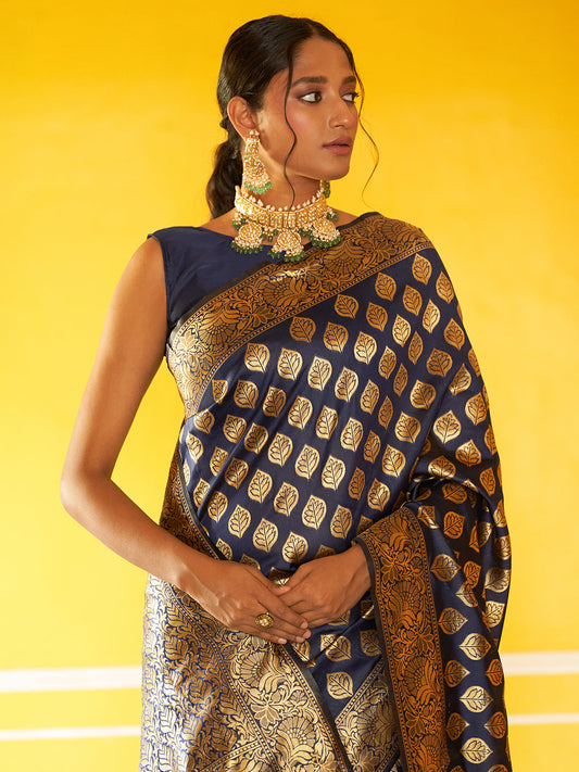 Navy Blue Banarasi Silk Woven Ethnic Motifs Saree with Unstitched Blouse Piece