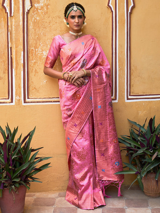 Pink Organza Woven Ethnic Motifs Saree with Unstitched Blouse Piece