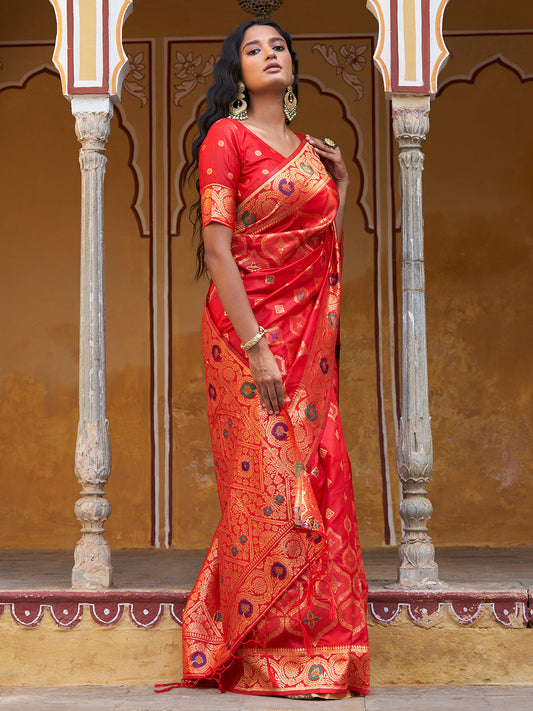 Red Banarasi Silk Ethnic Motifs Saree with Unstitched Blouse Piece