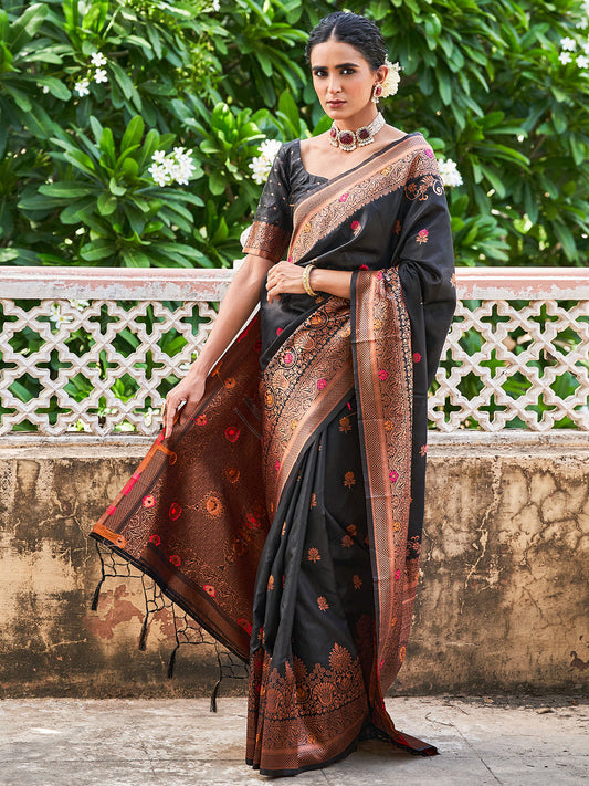 Black Banarasi Silk Woven Floral Design Saree with Unstitched Blouse Piece