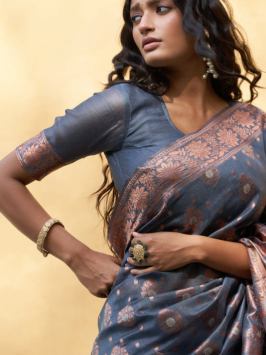 Dark Grey Chanderi Silk Ethnic Motifs Saree with Unstitched Blouse Piece