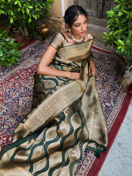 Dark Green Organza Woven Ethnic Motifs Saree with Unstitched Blouse Piece