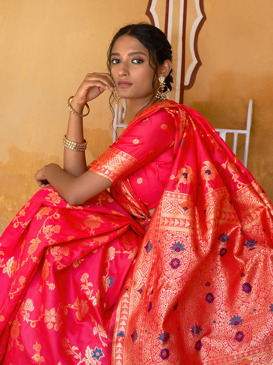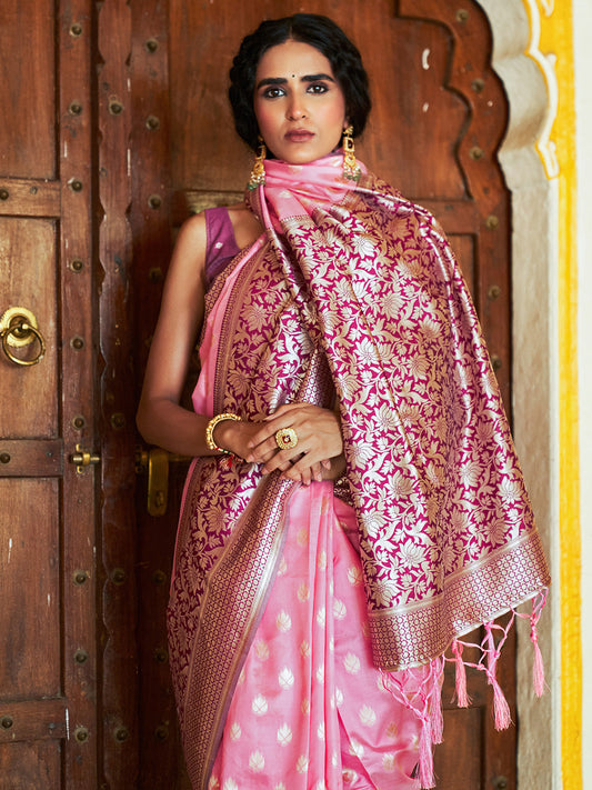 Pink Banarasi Silk Floral Saree with Unstitched Blouse Piece