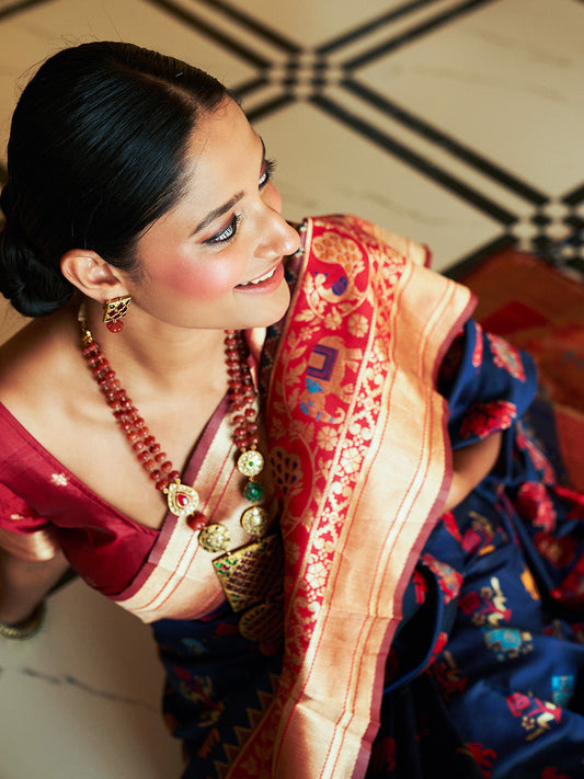 Wine Paithani Silk Woven Bagh Design Saree with Unstitched Blouse Piece