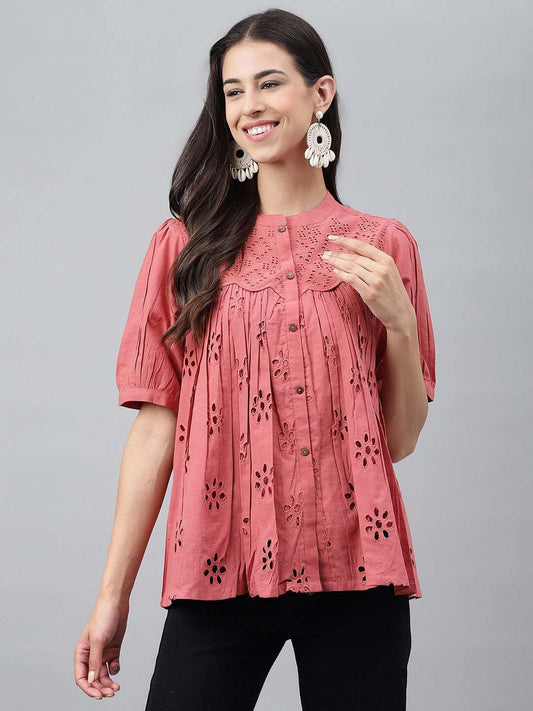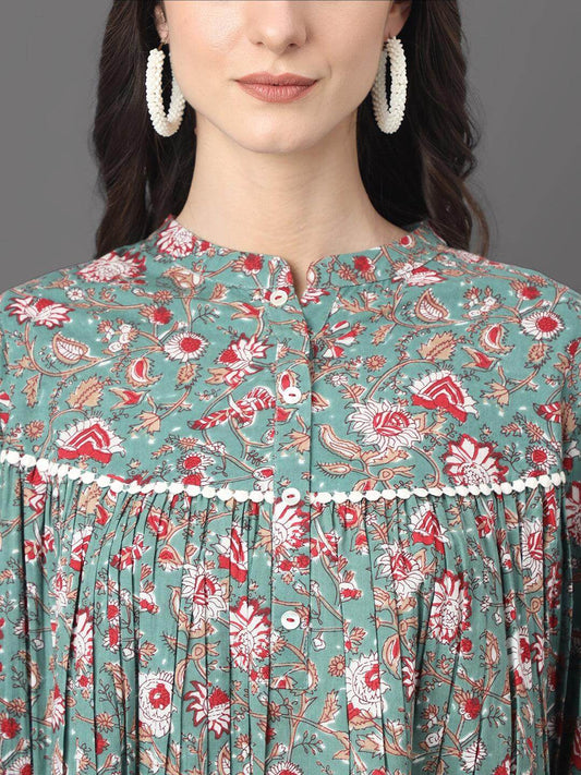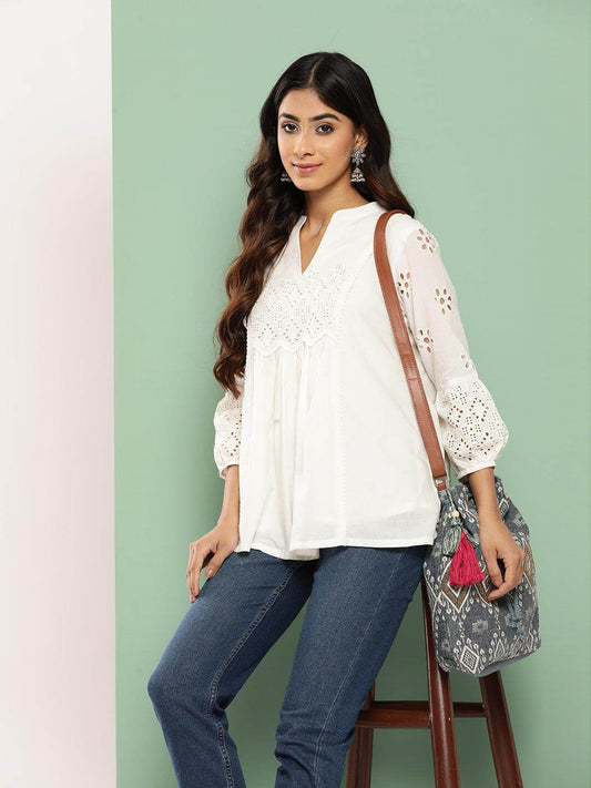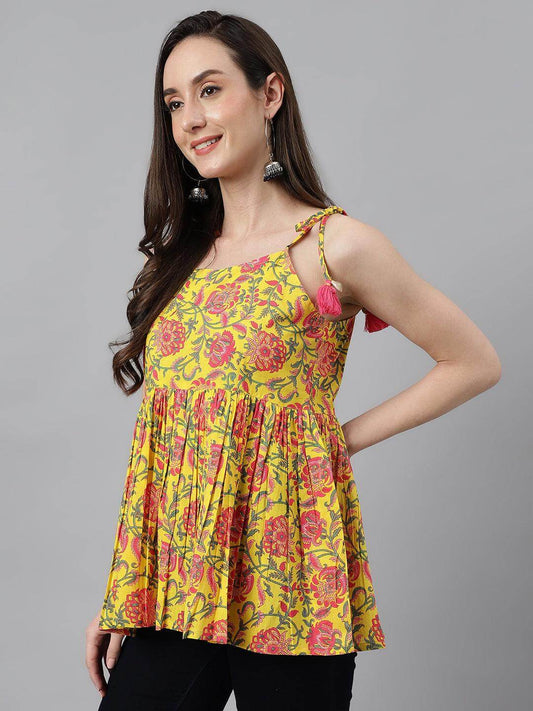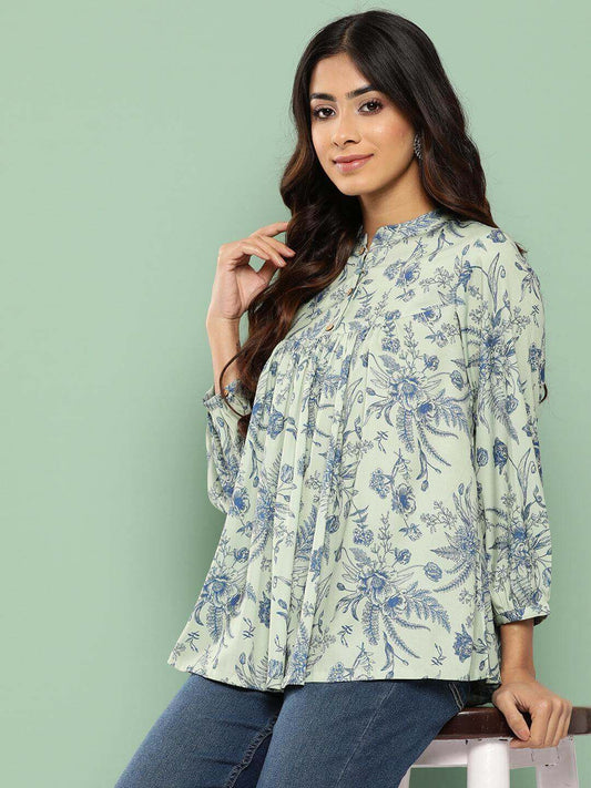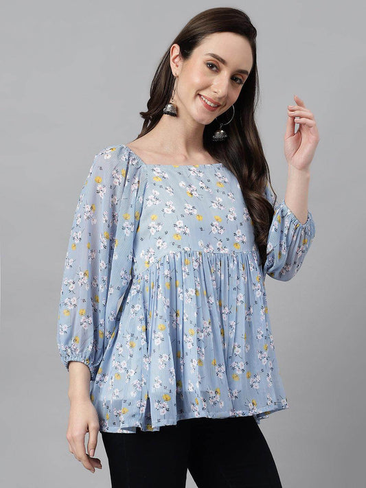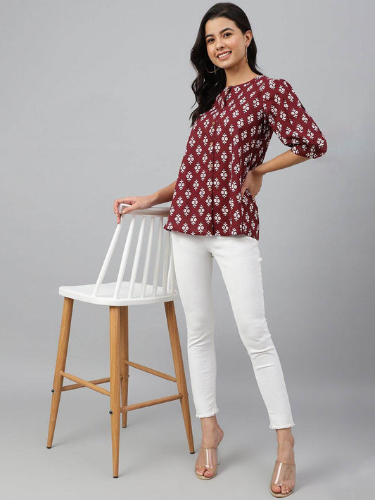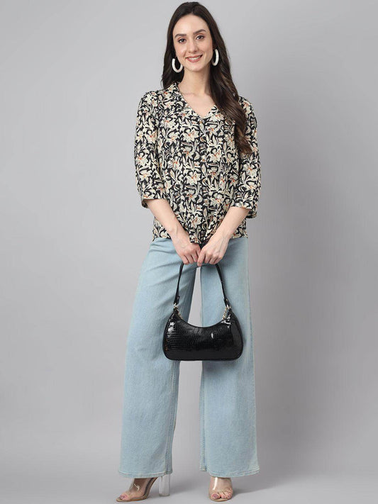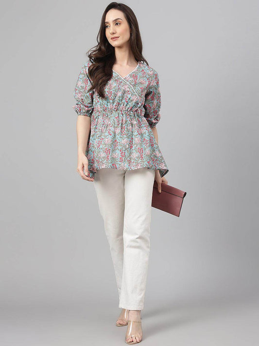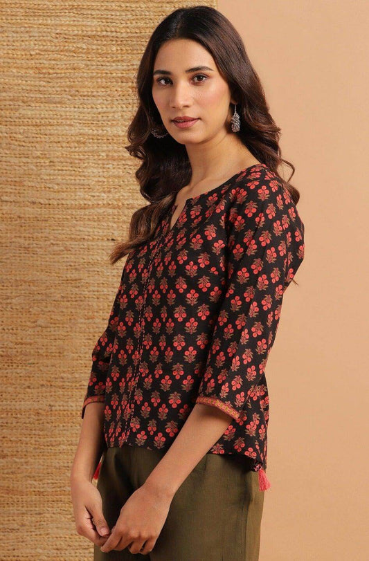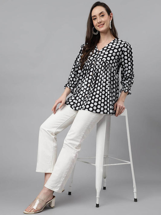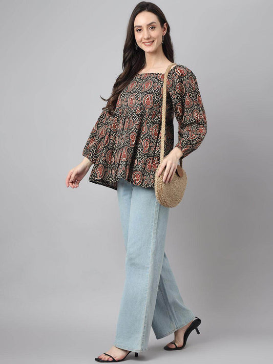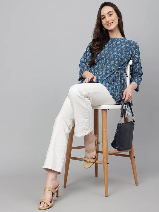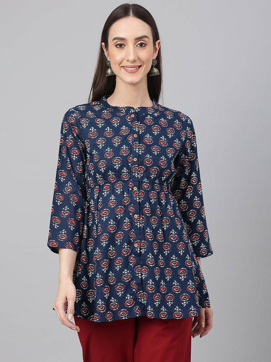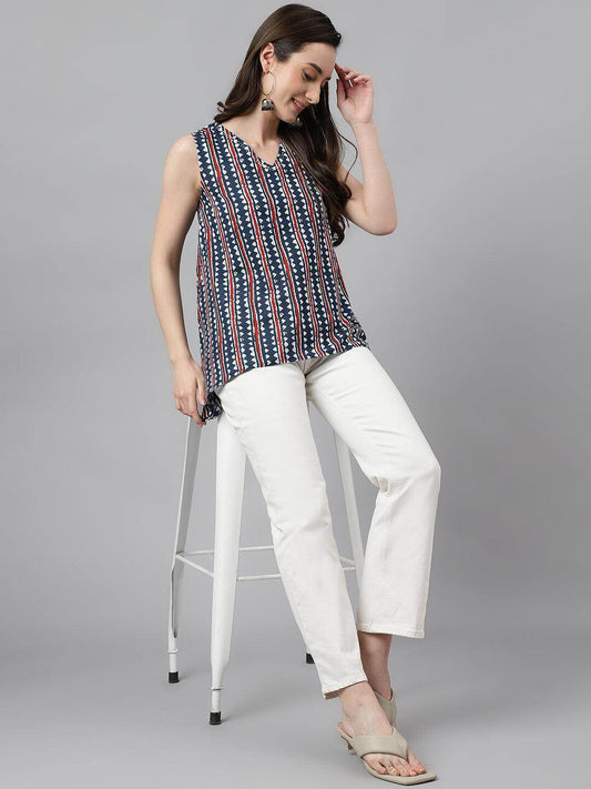 Women's Navy Blue Cotton Geometric Print High Low Top