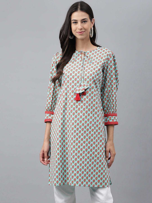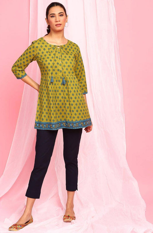 Green Cotton Ethnic Motifs Empire Waist Tunic