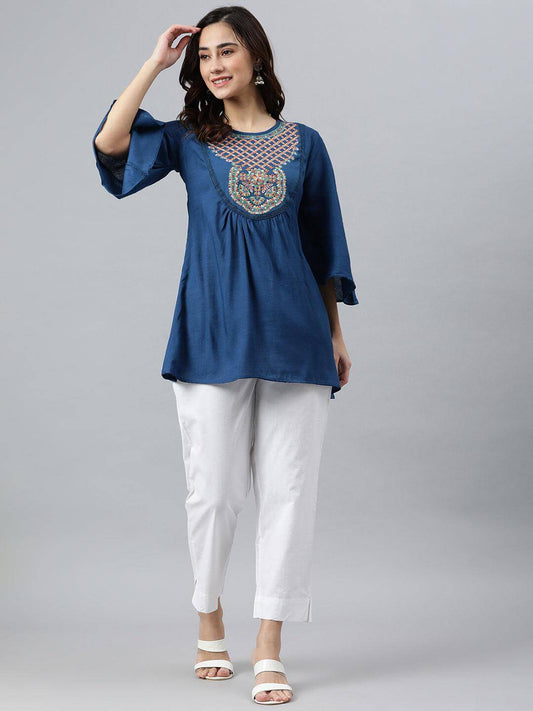 Navy Blue Cotton Embroidered Trapeze Tunic