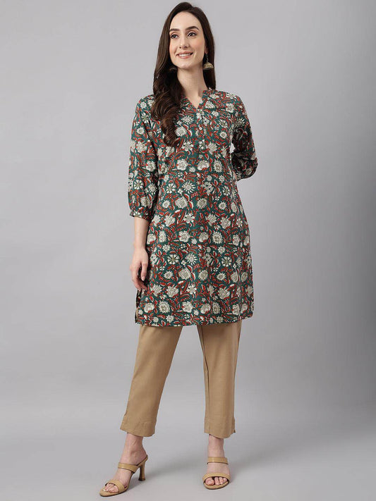 Women's DarkGreen Cotton Floral Print Regular Tunic