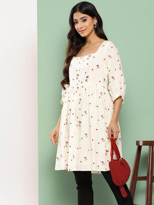 Off White Cambric Cotton Botanical Print Flared Tunic