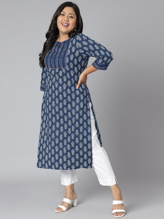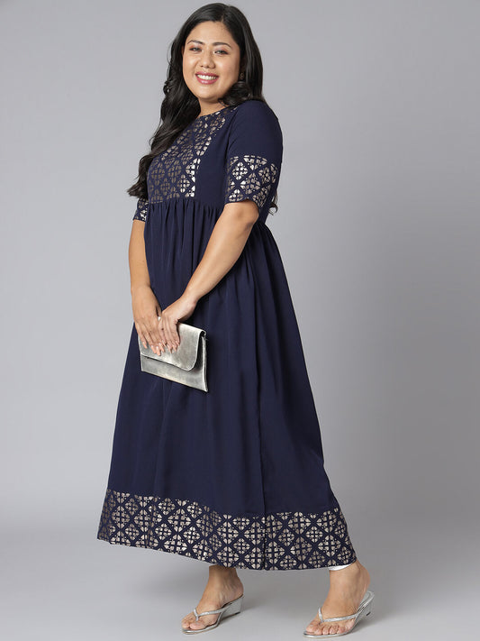 Plus Size Dark Blue Poly Crepe Foil Print Flared Kurta