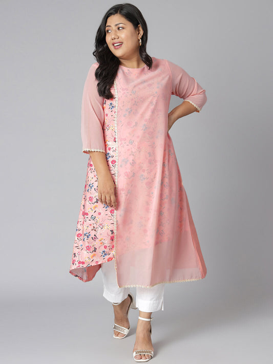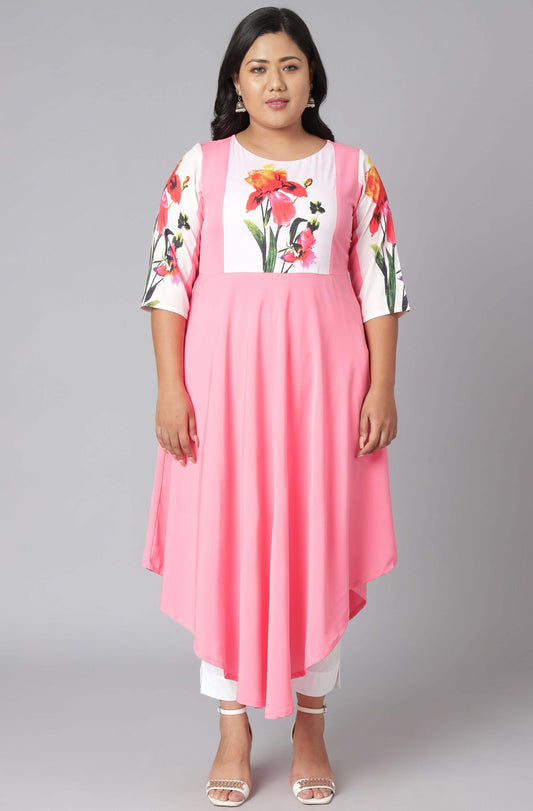 Plus Size Pink Poly Crepe Floral Print High Low Kurta