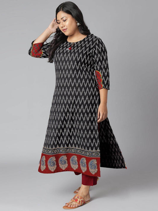 Plus Size Black Cotton Flex Ikat Straight Kurta