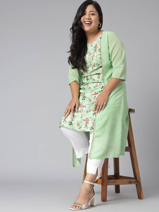 Plus Size Green Poly Crepe Floral Print A-line Kurta