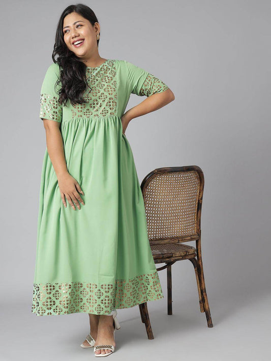 Plus Size Green Poly Crepe Foil Print Flared Kurta