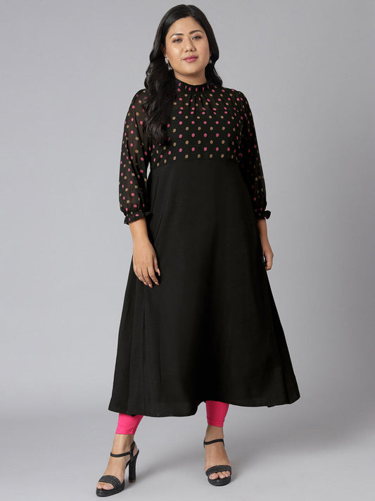 Plus Size Black Poly Crepe Polka Print A-line Kurta