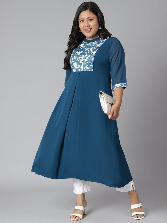 Plus Size Teal Poly Crepe Floral Print A-line Kurta