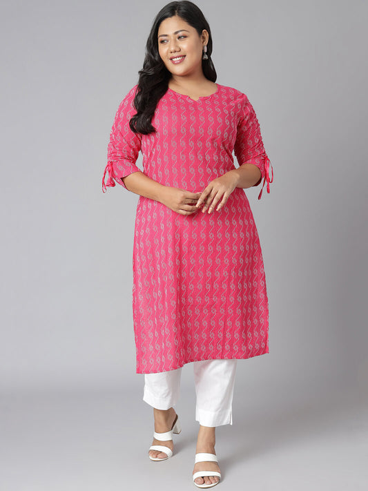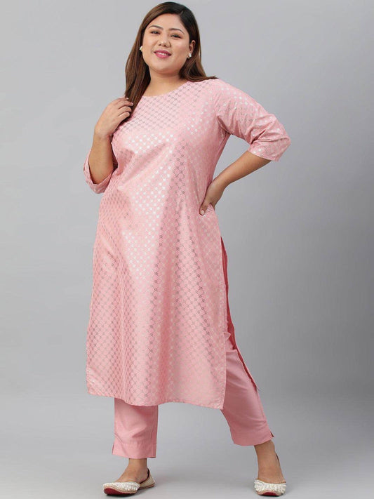 Plus Size Pink Cotton Woven Design Straight Kurta