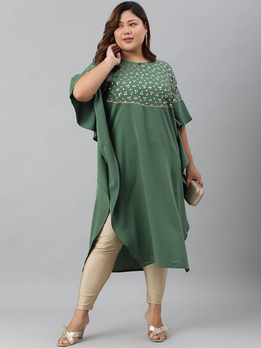 Plus Size Green Poly Crepe Foil Print Kaftan kurta