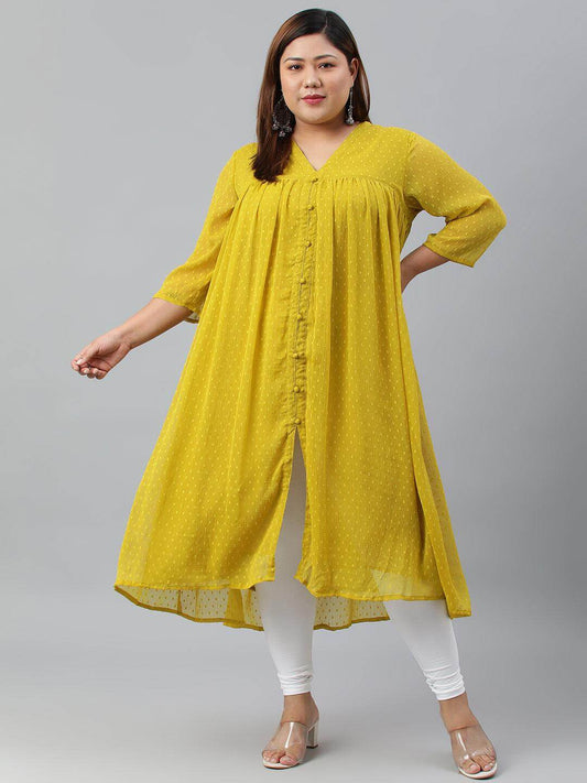 Plus Size Mustard Poly Chiffon Self Design Flared kurta