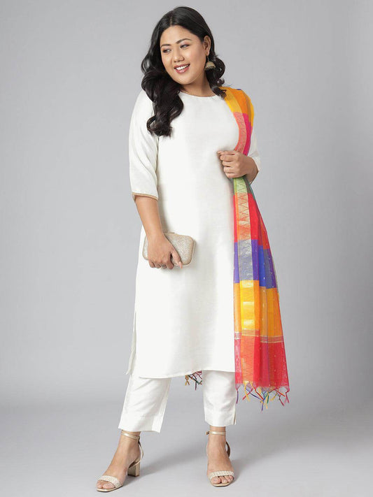 Plus Size Off-White Poly Silk Kurta With Pant and Dupatta