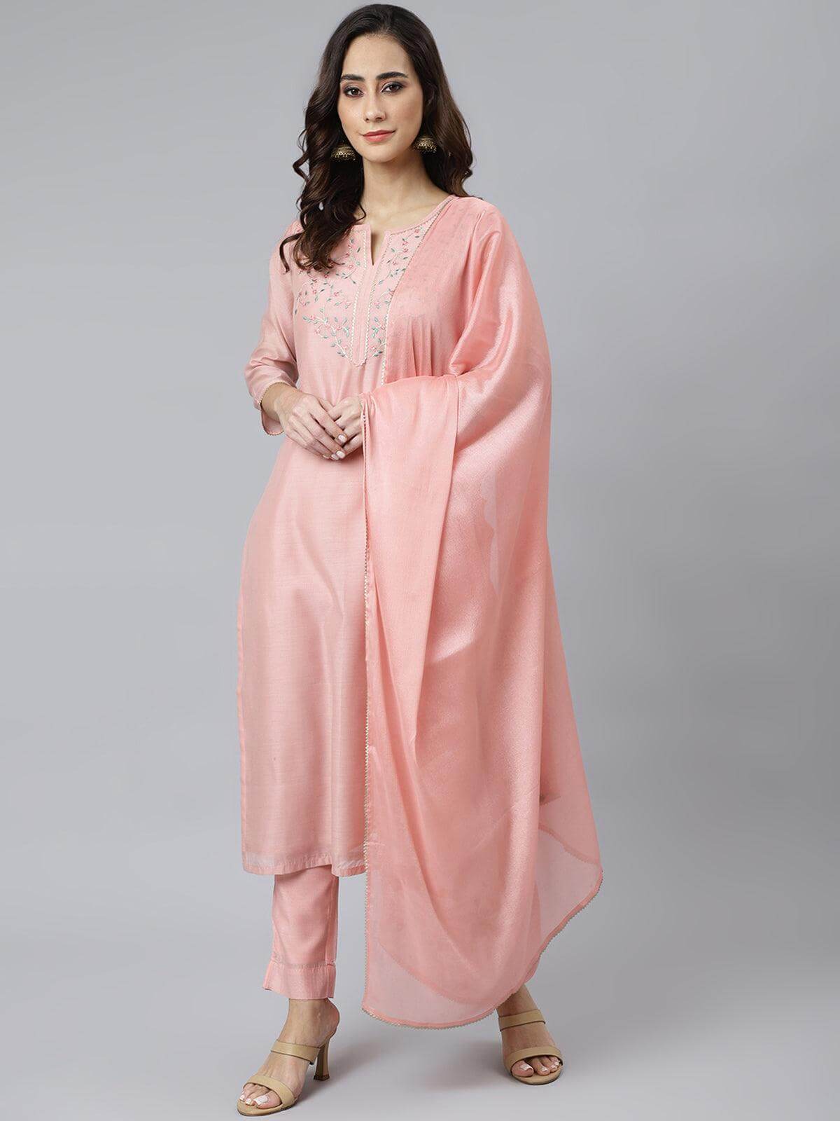 - Janasya is here to serve you this baby pink poly silk kurta set. It features straight kurta, round-neck, 3/4 sleeves and has lace and embroidery detailing on the sleeves and neck. It comes along with pants and dupatta which enhance the whole look. Team it up with minimal accessories to complete the look.