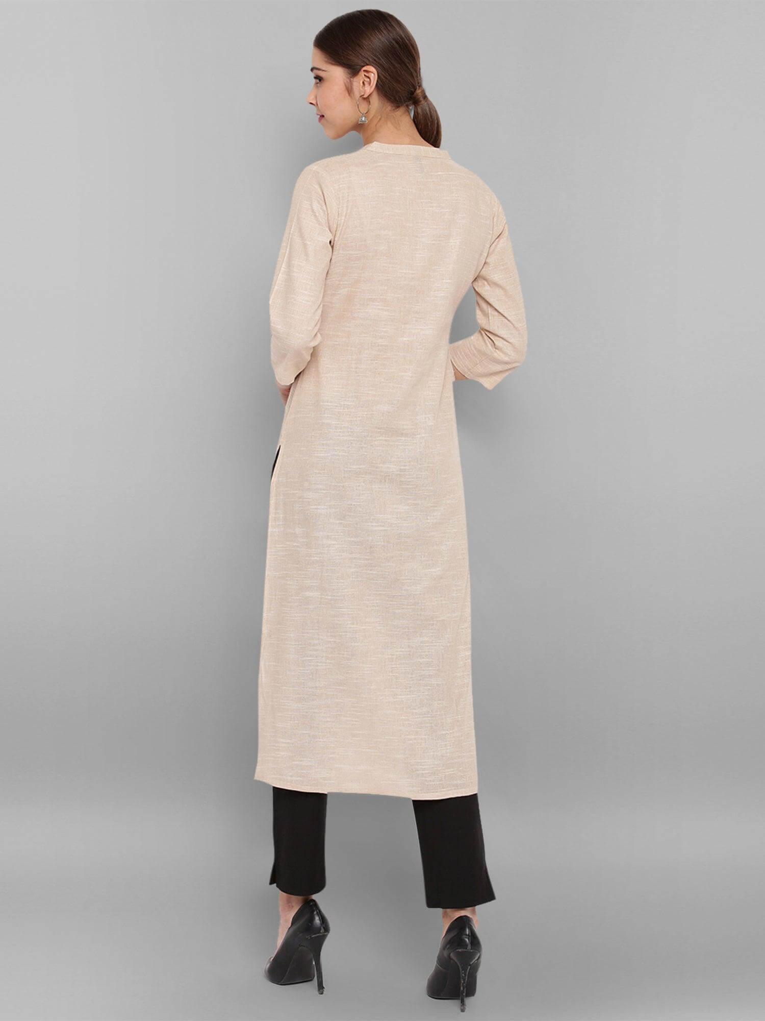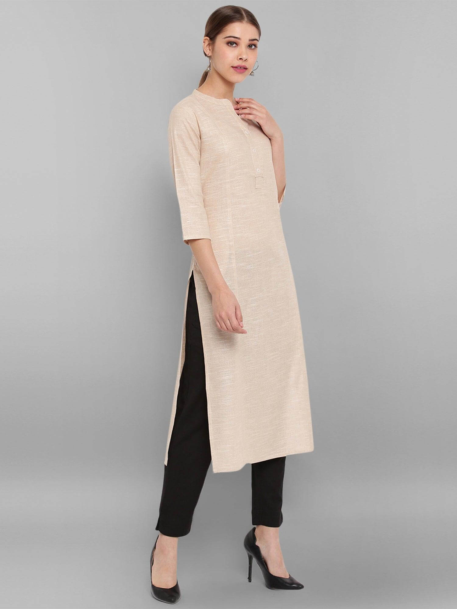 - This breathable and stylish kurta from Janasya is a must-have item for any wardrobe. This cotton linen blended kurta has weaving in white and beige yarns making it look chic. This mandarin collar kurta has mock button placket along with three quarter sleeves but the best thing about this kurta is it has a concealed side pocket to keep your precious belongings near you. Team it up with pants for complete look