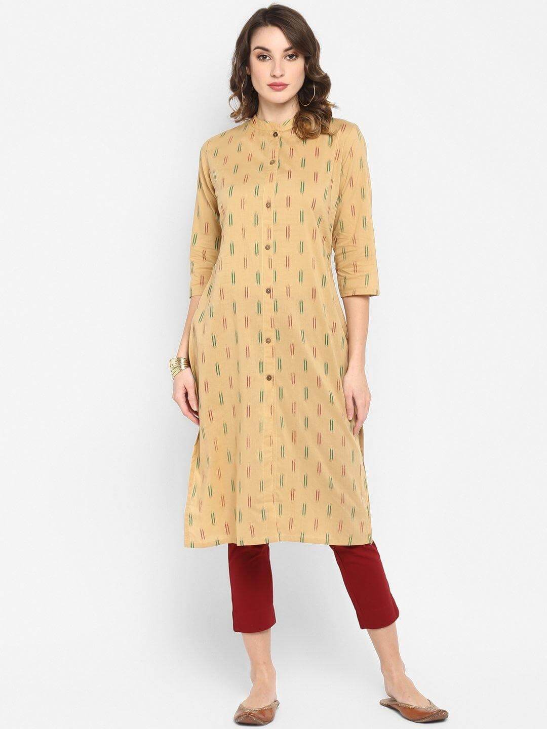 - This stylish Ikat print kurta from janasya is made of pure cotton and comes in an attractive beige color. It features 3/4 sleeve,chinese neck,straight and it is calf length kurta that is suitable for casual occasions. Team it with matching leggings for a chic look.