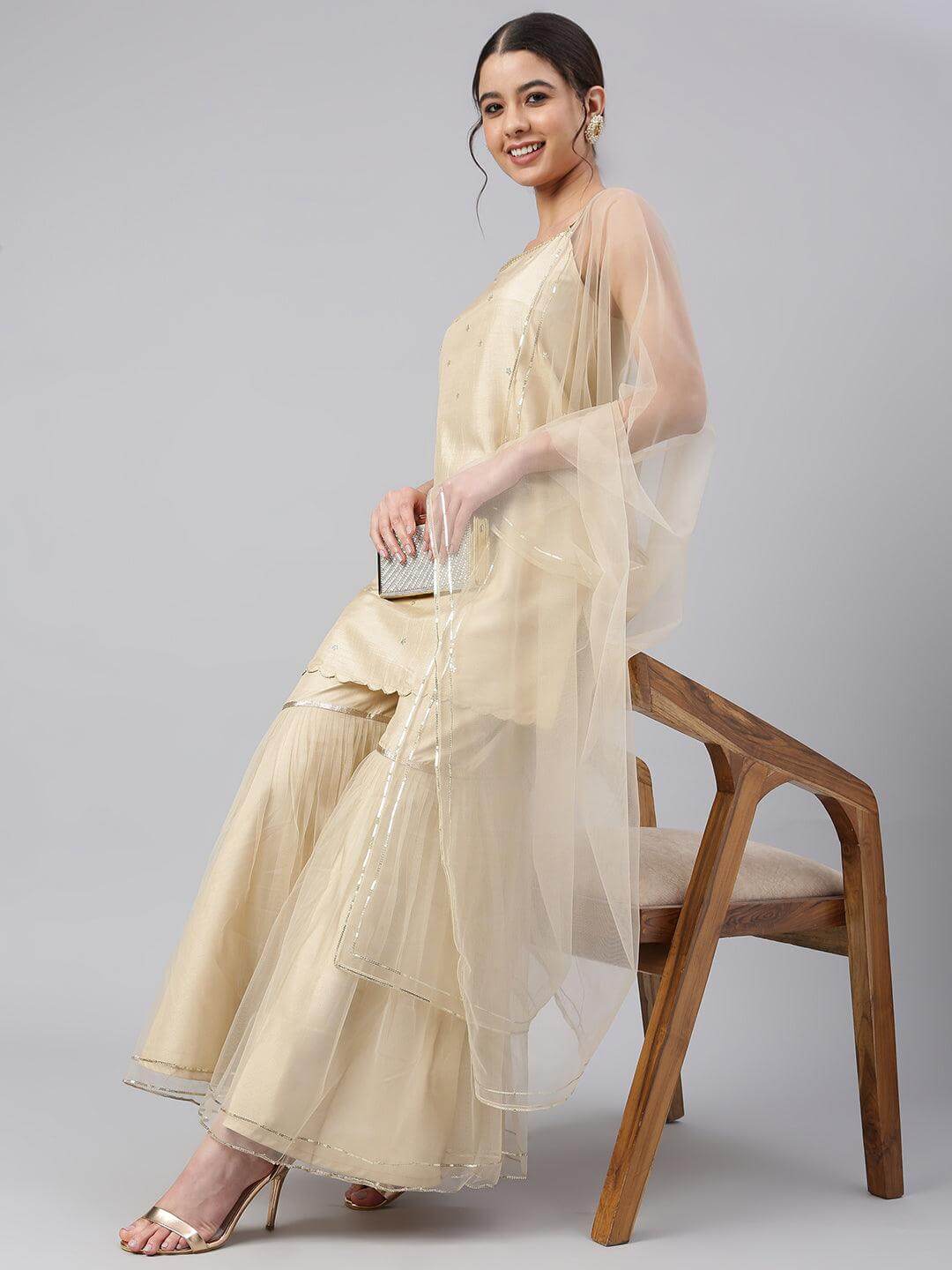 Beige Poly Silk Embellished Kurta with Gharara and Dupatta