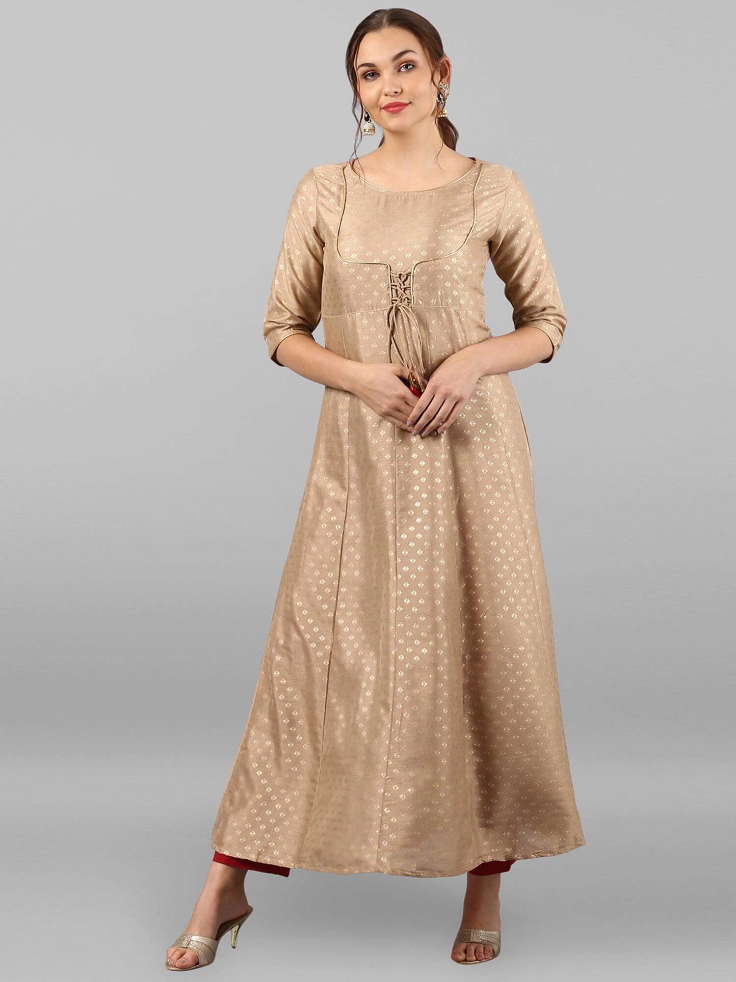 - This stylish foil print kurta from janasya is made of poly silk and comes in an attractive beige color. It features 3/4 sleeve,round neck,anarkali and it is ankle length kurta that is suitable for casual occasions. Team it with matching leggings for a chic look.