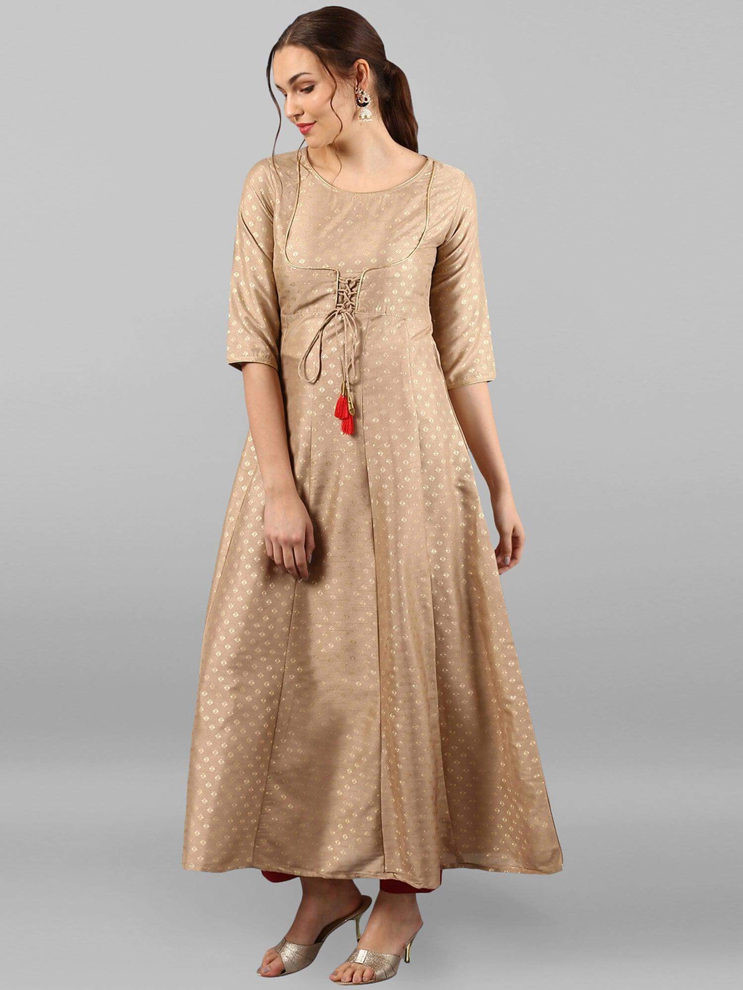 - Style:- Length: 52(inch) | Pattern: Foil Printed | Occasion: Casual | Type: Anarkali | Sleeve Type: 3/4 Sleeves Regular Sleeves | Color: Beige