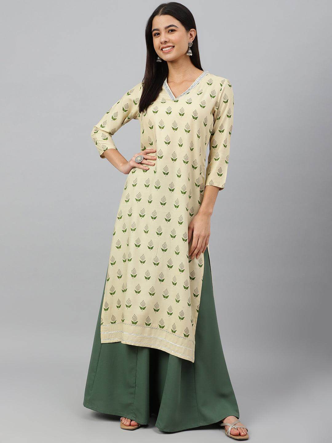 - Give your everyday fashion a twist with this beige rayon botanical print kurta featuring V-neck with gota-detailing over neckline and hemline of the kurta, 3/4 sleeves with straight fit