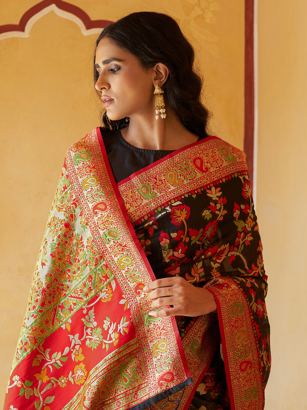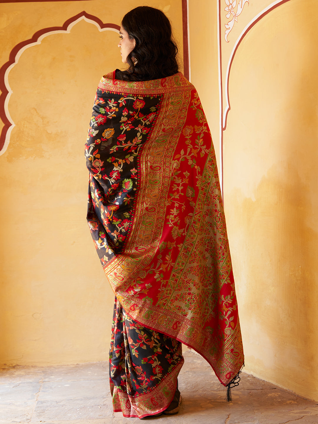 Black Chanderi Silk Pashmina Saree with Unstitched Blouse Piece