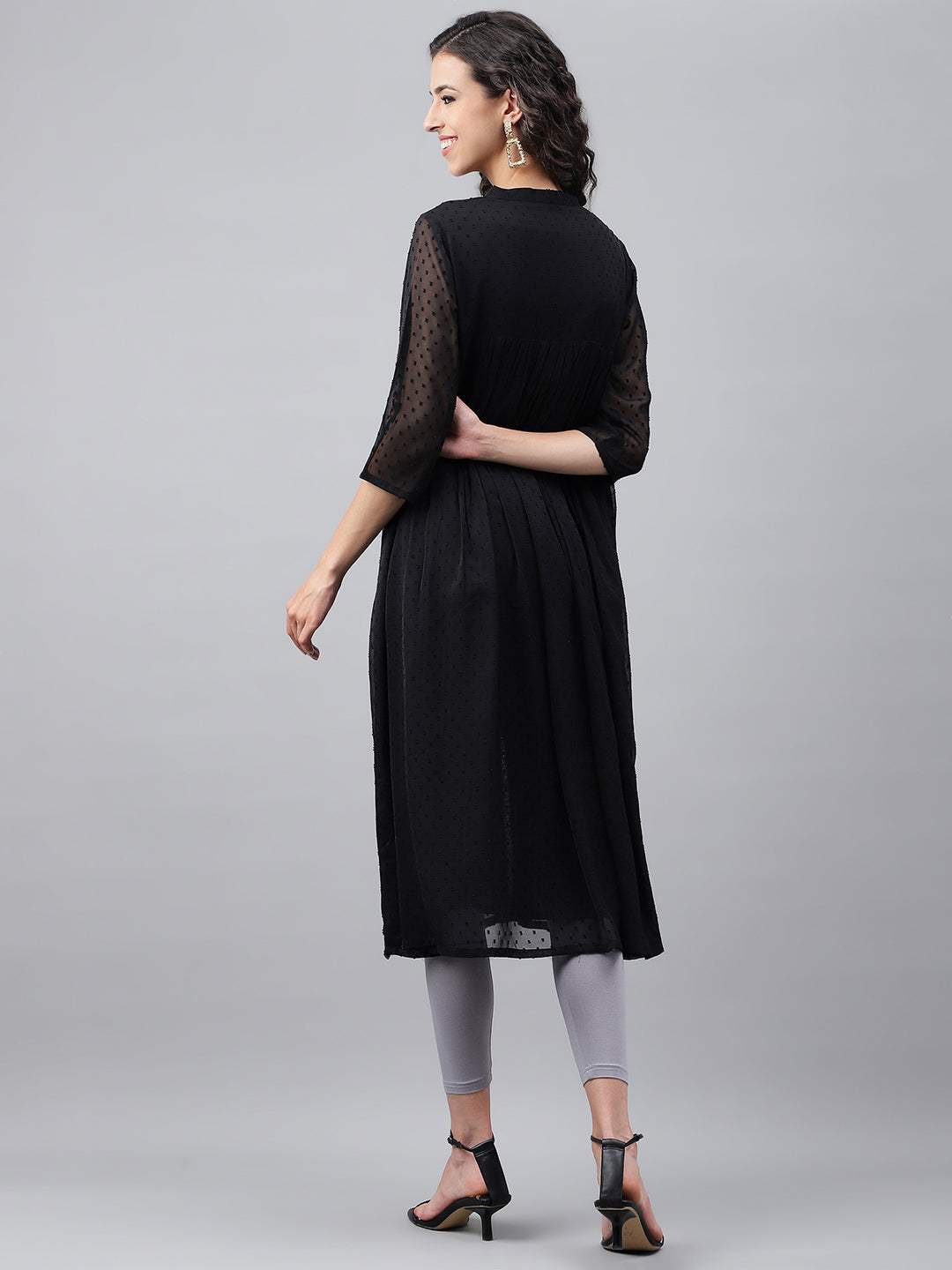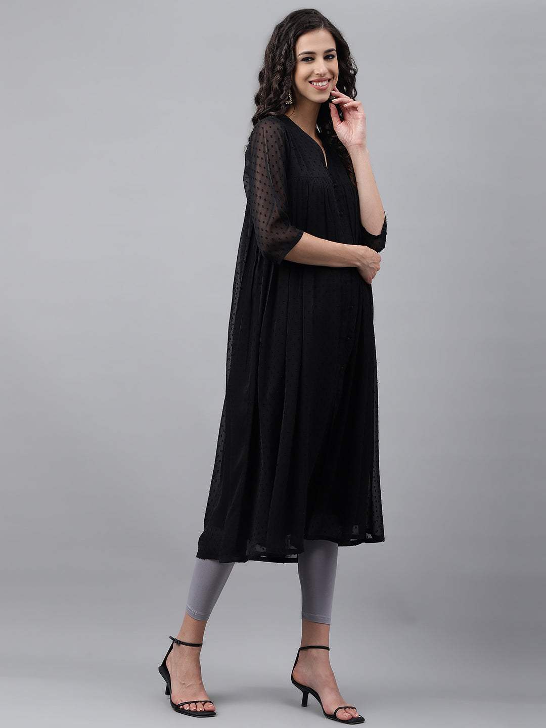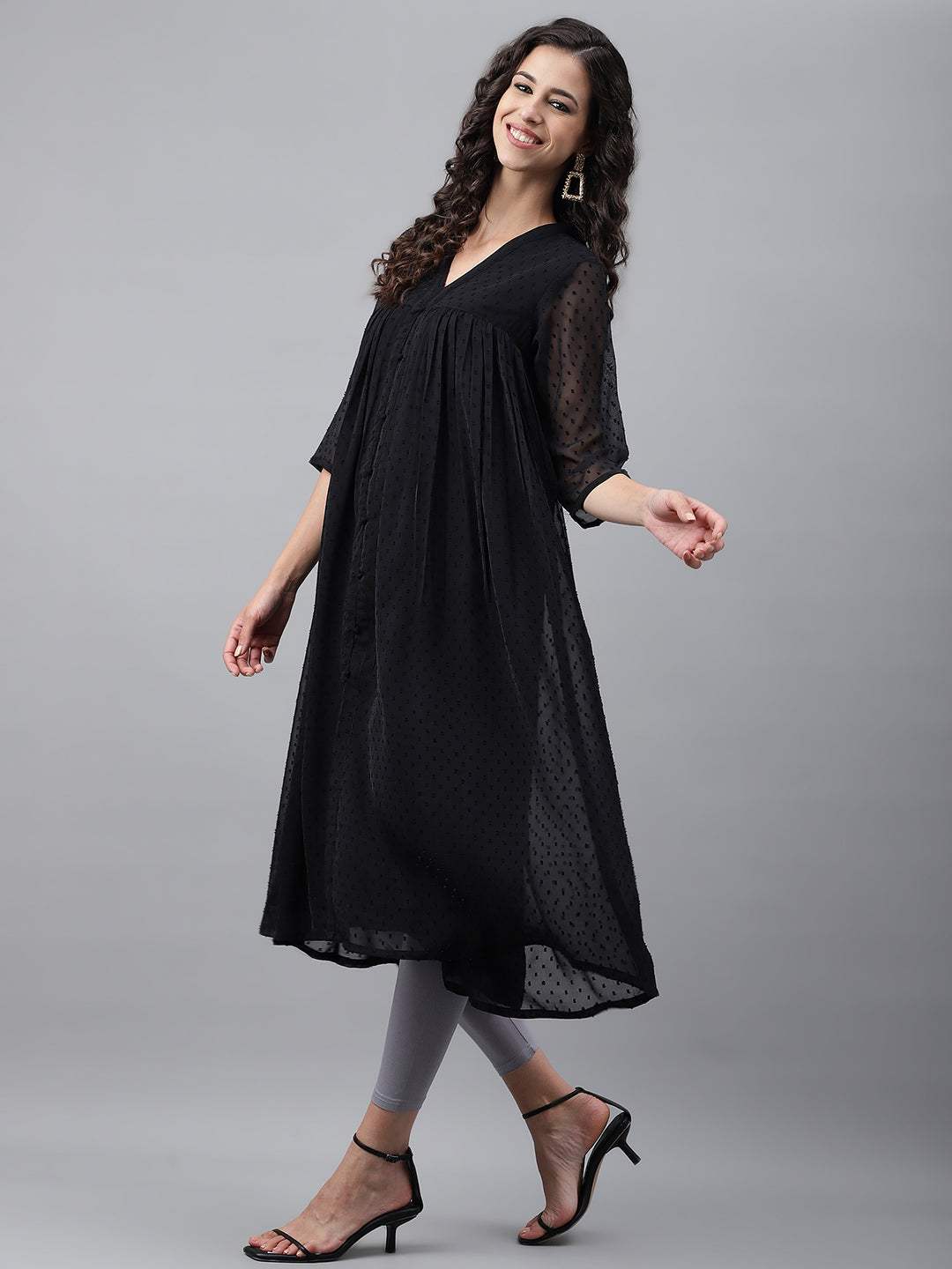 - Style:- Length: 43(inch) | Pattern: Self Design | Occasion: Occasion | Type: Empire | Sleeve Type: 3/4 Sleeves Regular Sleeves | Color: Black