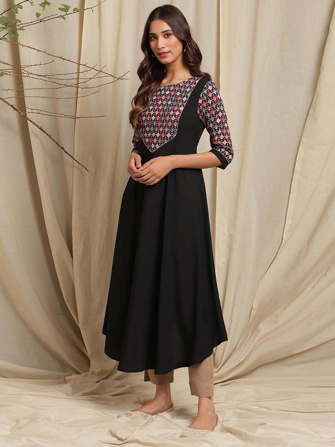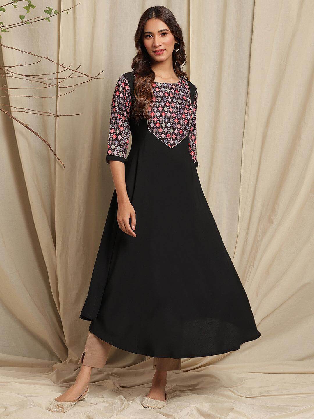 - You'll love the elegant design and fit of this stunning digital print kurta from Janasya. It features round neck with digital print patch on yoke and 3/4th sleeve detailed with gold piping and an elegant yet stylish A-line cut which is little high low. Look stylish yet comfortable for the day with this black poly crepe kurta when paired with pants and wooden jewellery.