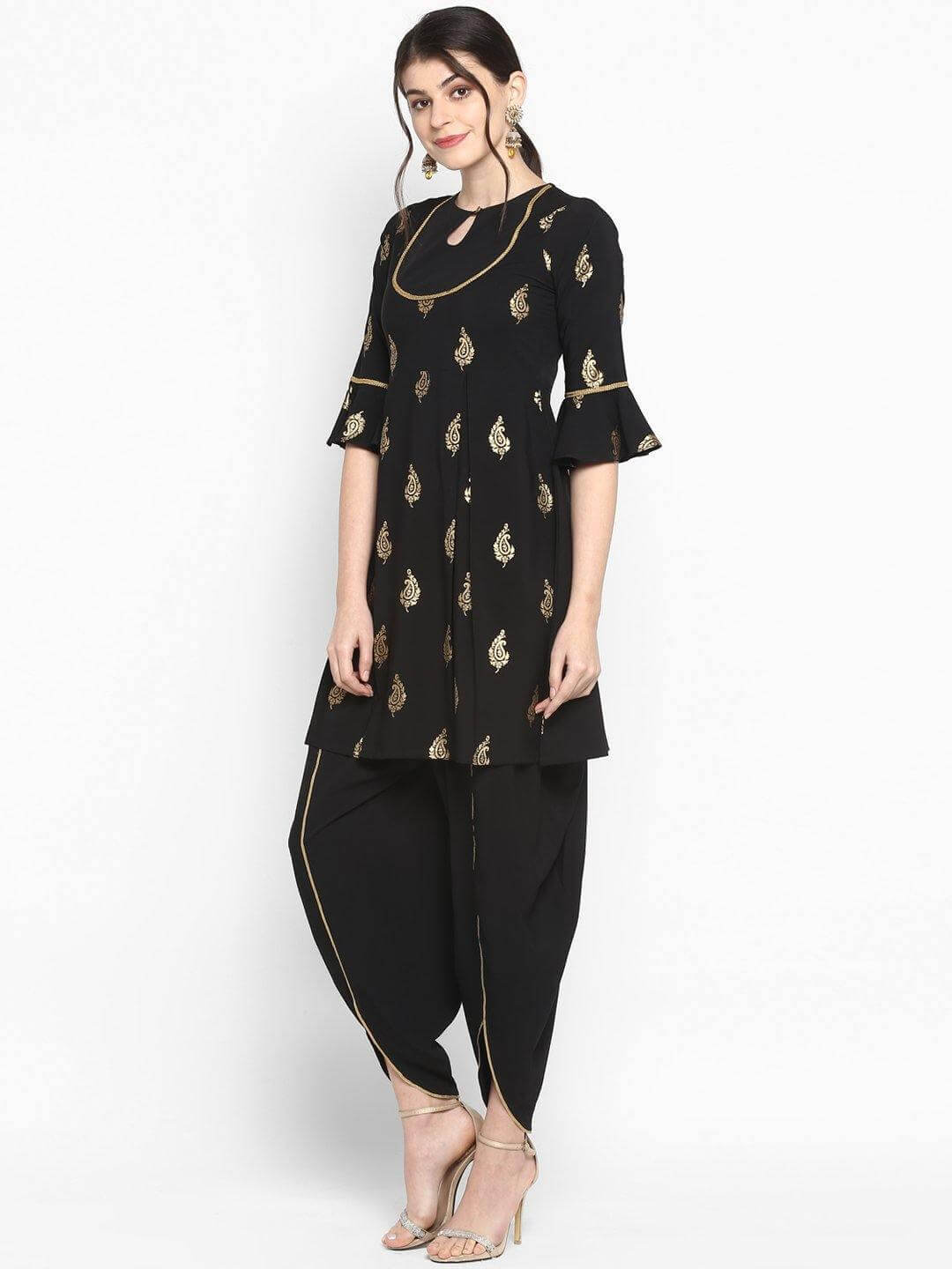 - Kurti Length: 36(inch) | Bottom Length: 38(inch) | Kurti Color: Black | Pattern: Gold Printed | Occasion: Casual | Type: A-Line | Sleeve Type: Bell Sleeve Bell Sleeve