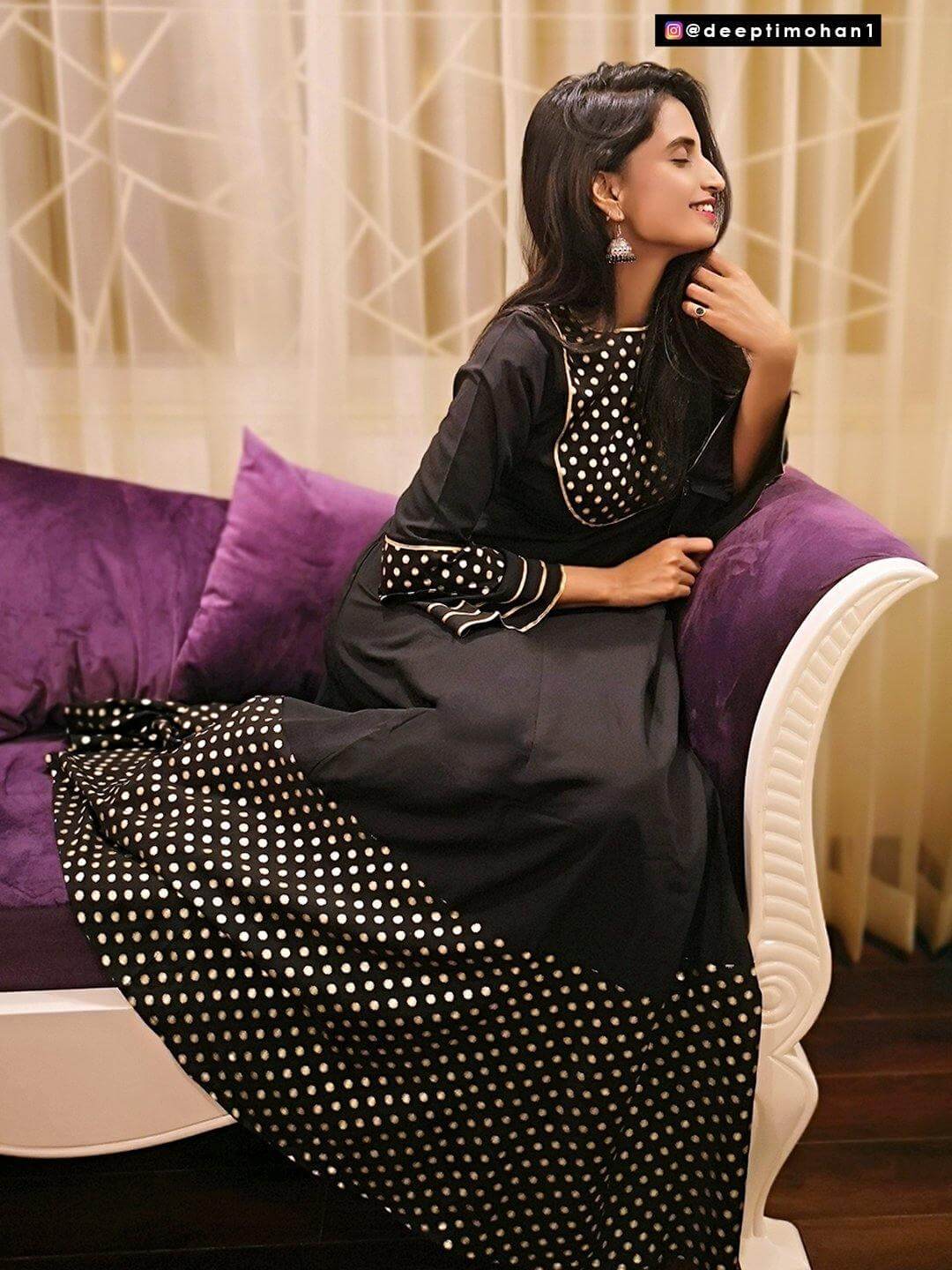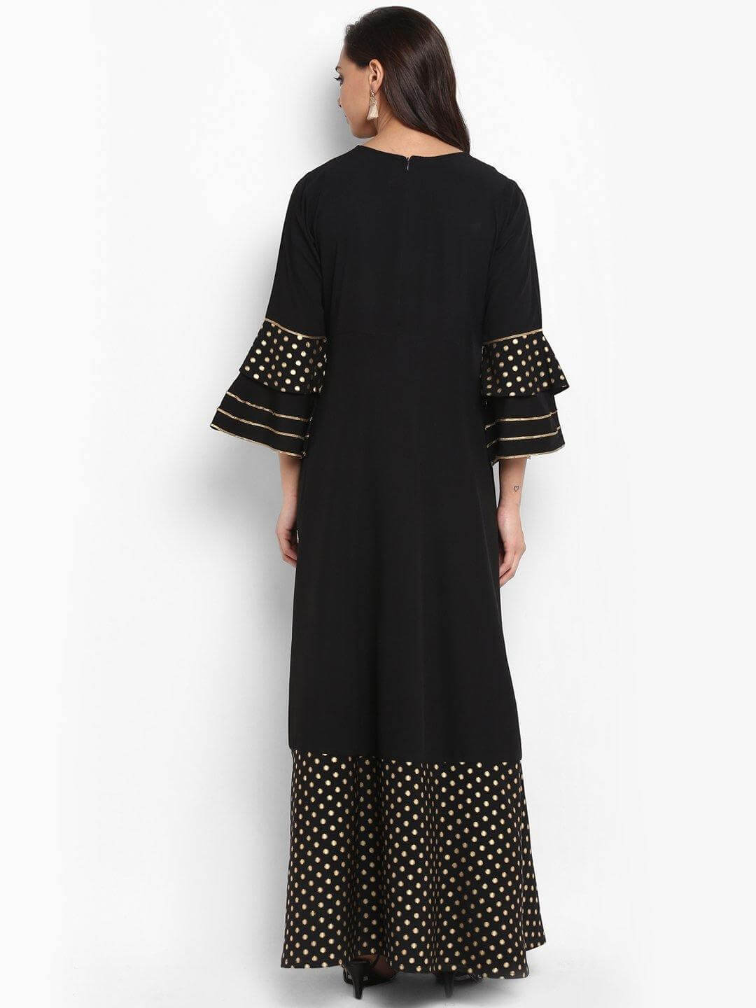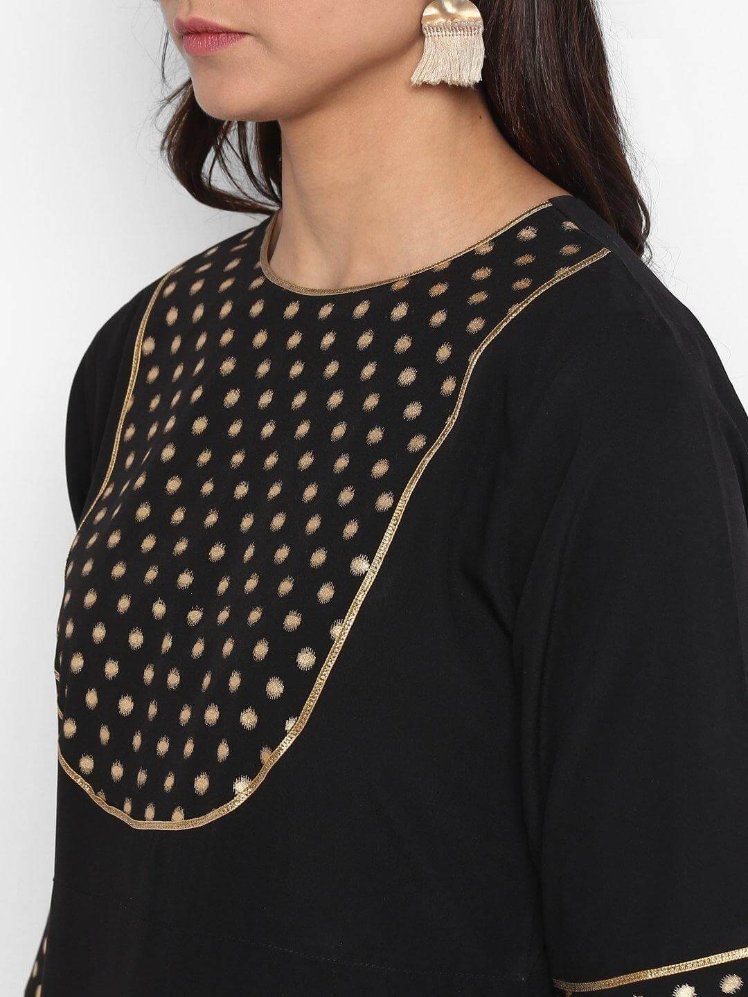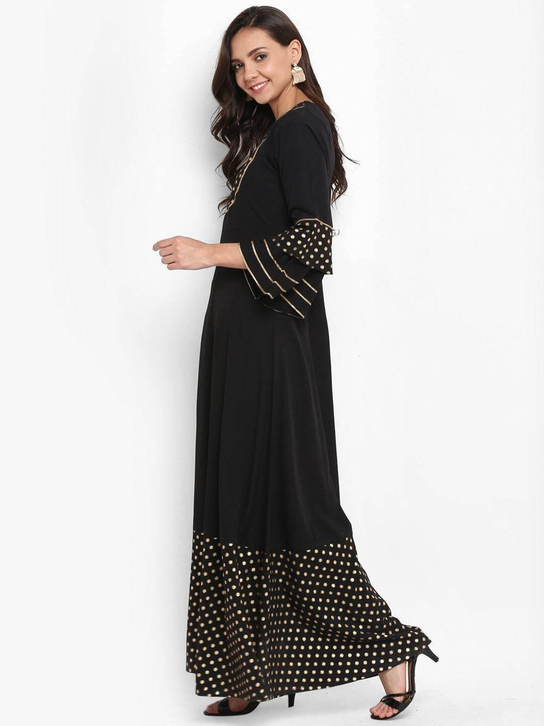 - This stylish gold print kurta from janasya is made of poly crepe and comes in an attractive black color. It features bell sleeve,round neck,anarkali and it is ankle length kurta that is suitable for casual occasions. Team it with matching leggings for a chic look.