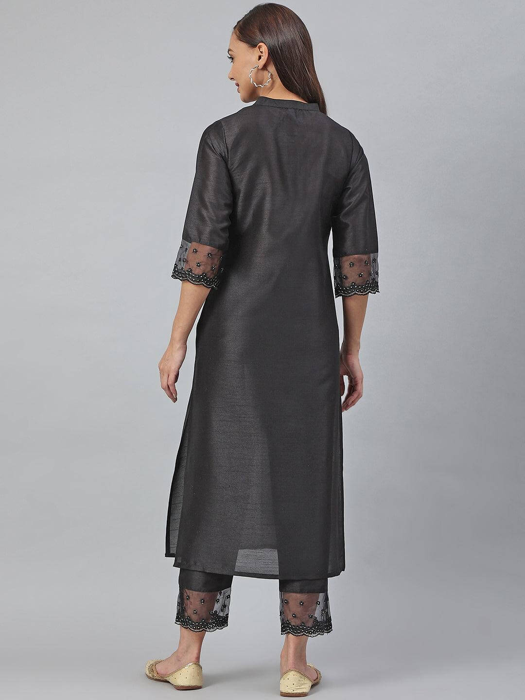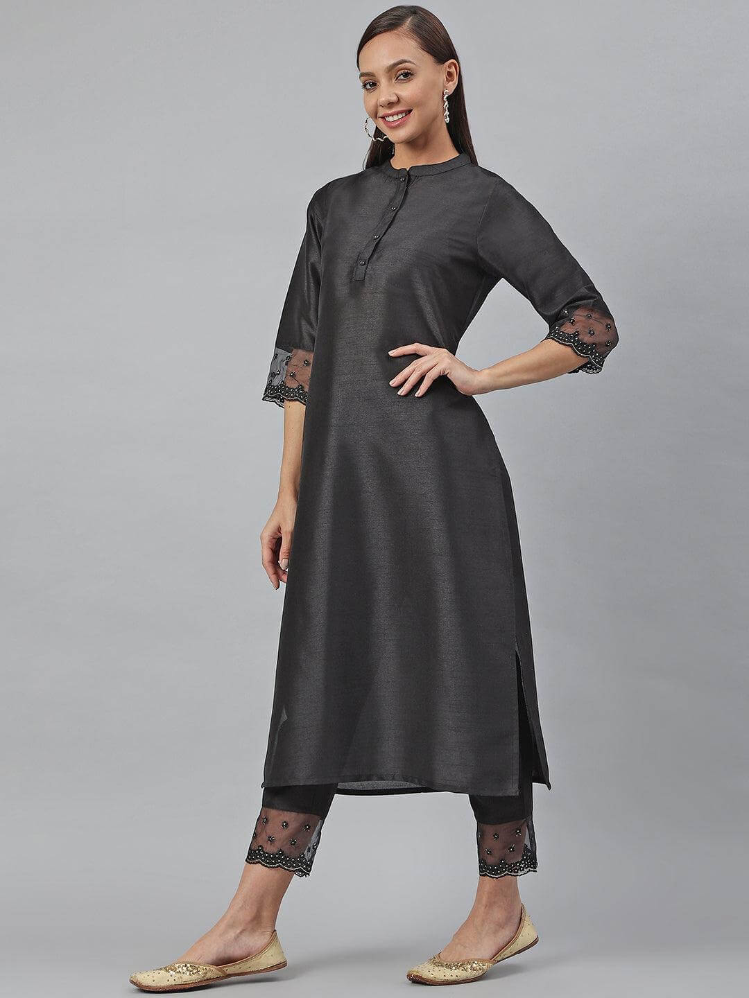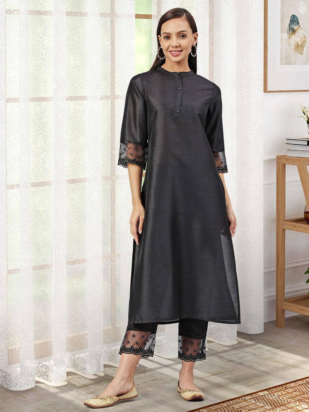 - Drop down the spotlight by donning this black kurta set from Janasya. This set features a straight silhouette with a embroidery on sleeve enhanced with tissue fabric. It comes with matching pant with tissue and embroidery detail on hem. Wear it with chaandbalis and block sandals for an elegant look.