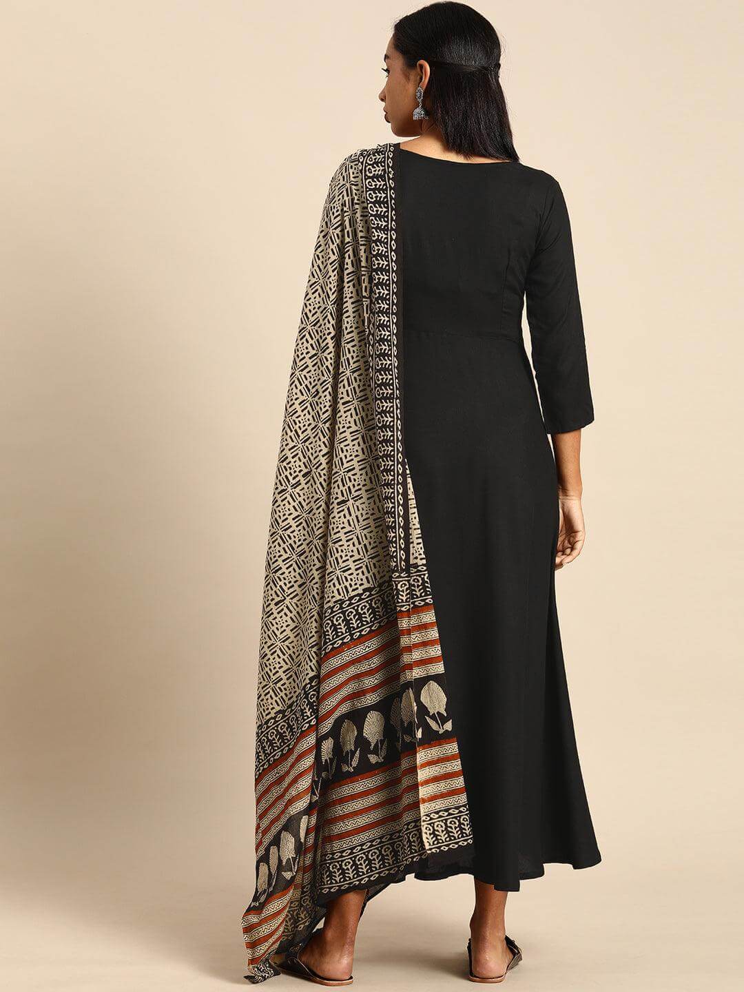 - Style:-Kurta Length: 50(inch), Bottom Length: (inch) | Pattern: Solid | Occasion: Casual | Type: Flared | Sleeve Type: 3/4 Sleeve Regular Sleeves | Color: Black
