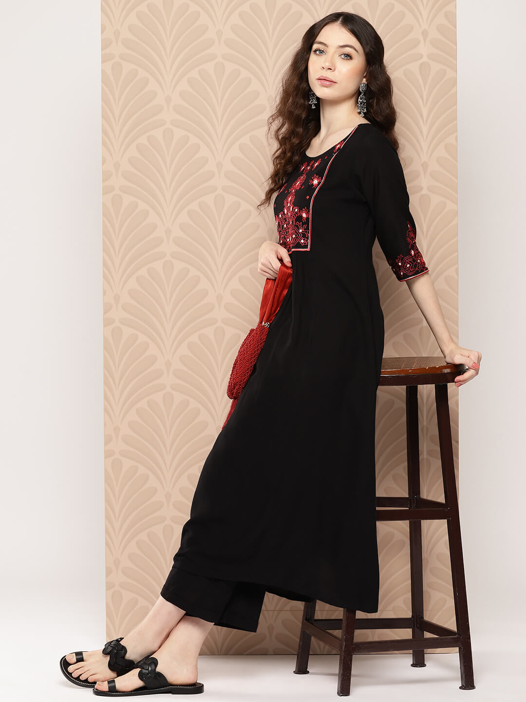 - Style:- Length: 48(inch) | Pattern: Yoke Embroidered | Occasion: Casual | Type: A-Line | Sleeve Type: 3/4th Sleeves Regular Sleeves | Color: Black