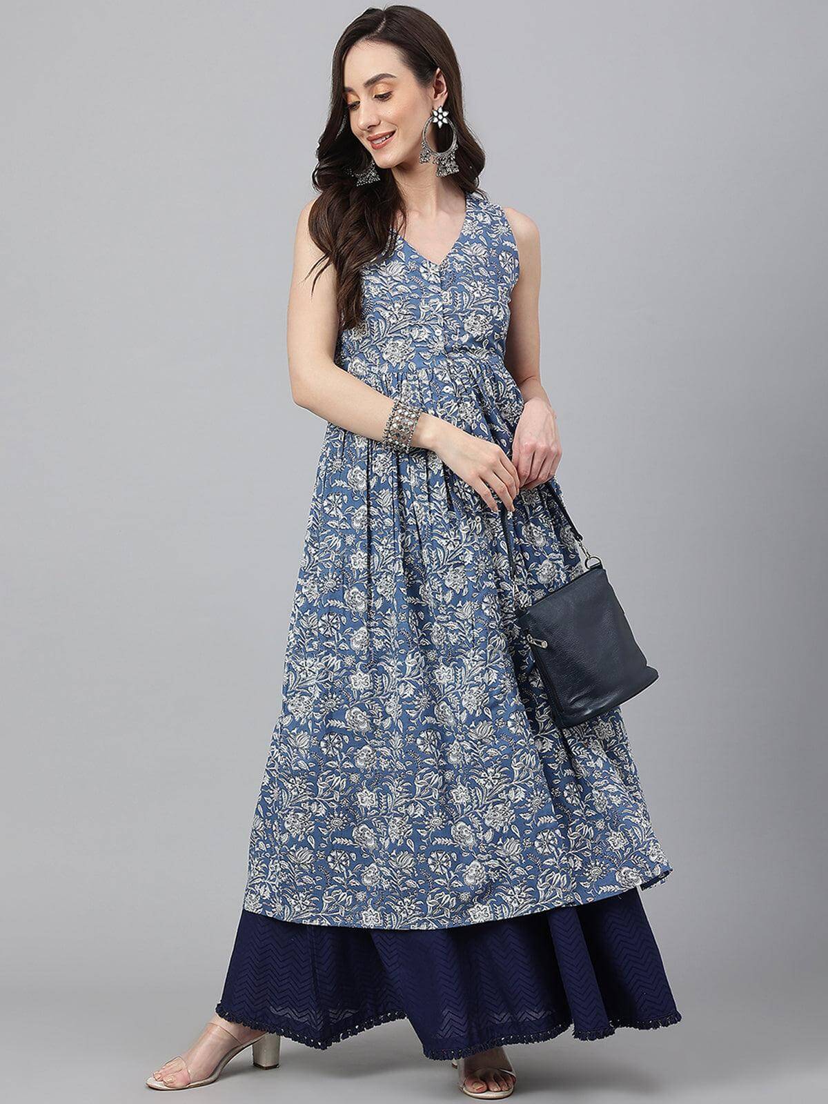 - Blue cotton floral printed flared kurta crafted in cotton fabric featuring V-neck with shell button on the front yoke, sleeveless with fit and flare silhouette.