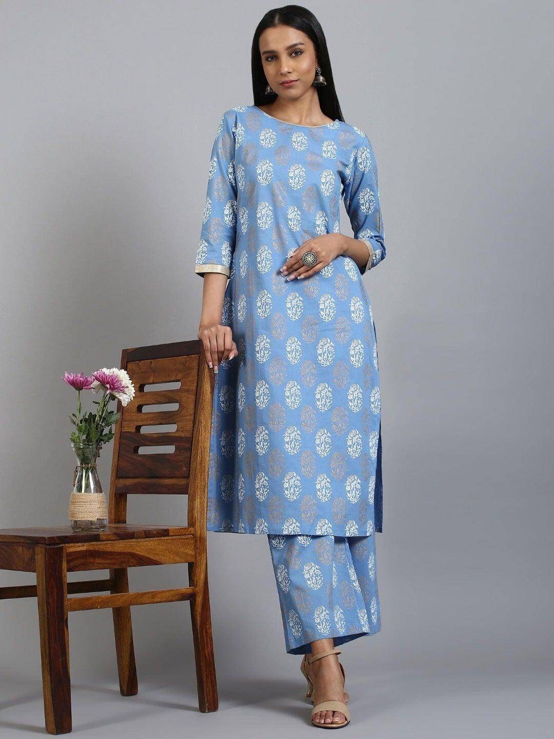 - Set the tone for this season with this one-of-a-kind Janasya kurta set. This set consists of a straight cotton kurta with straight Palazzo. Straight cotton kurta from this set features ethnic floral print set in white and gold-tone, gotta lace detailing on Sleeve hem enhancing the beauty of the kurta. The partially elasticized Palazzo features the same print as kurta completing the look. Team this blue piece with a pair of heels and a statement sling bag for a perfect brunch look.