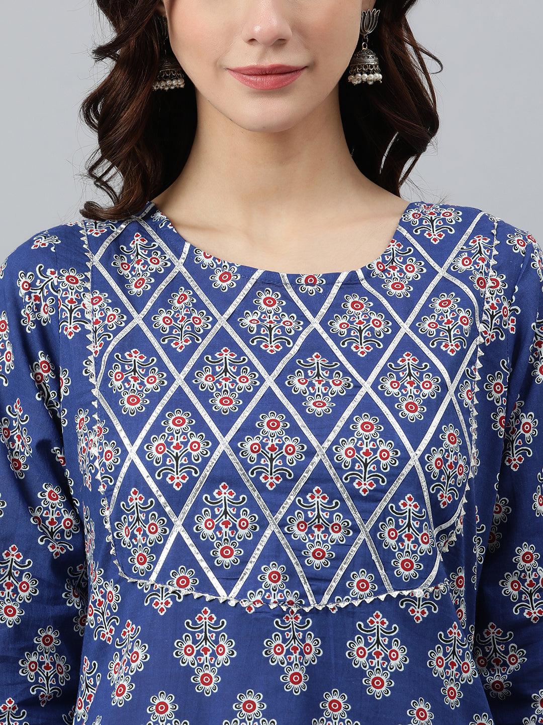 Blue Cotton Floral Print Straight Kurta
