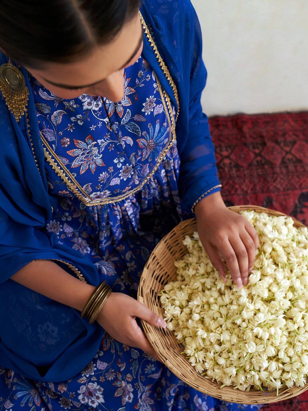 - Dark blue georgette digital floral printed kurta palazzo set with dupatta is a stunning ensemble by Janasya designed for festive occasions. The kurta is crafted from dark blue georgette fabric, featuring a beautiful digital floral print all over that adds a touch of elegance. The kurta has a flared silhouette and is adorned with a mandarin collar, giving it a stylish and traditional look. The 3/4th regular sleeves provide a comfortable fit. The yoke and sleeve hem of the kurta are embellished with exquisite gota work, adding intricate detailing and enhancing its overall appeal. The set includes a matching palazzo that complements the kurta perfectly. The palazzo features a digital floral print and has a fully elasticated waistband, ensuring a comfortable and adjustable fit for different body types.To complete the ensemble, a solid dark blue chiffon dupatta is included, adding a graceful touch. The dupatta is lightweight and measures an ideal length for draping and styling in various ways.