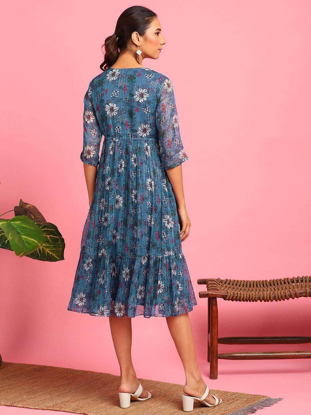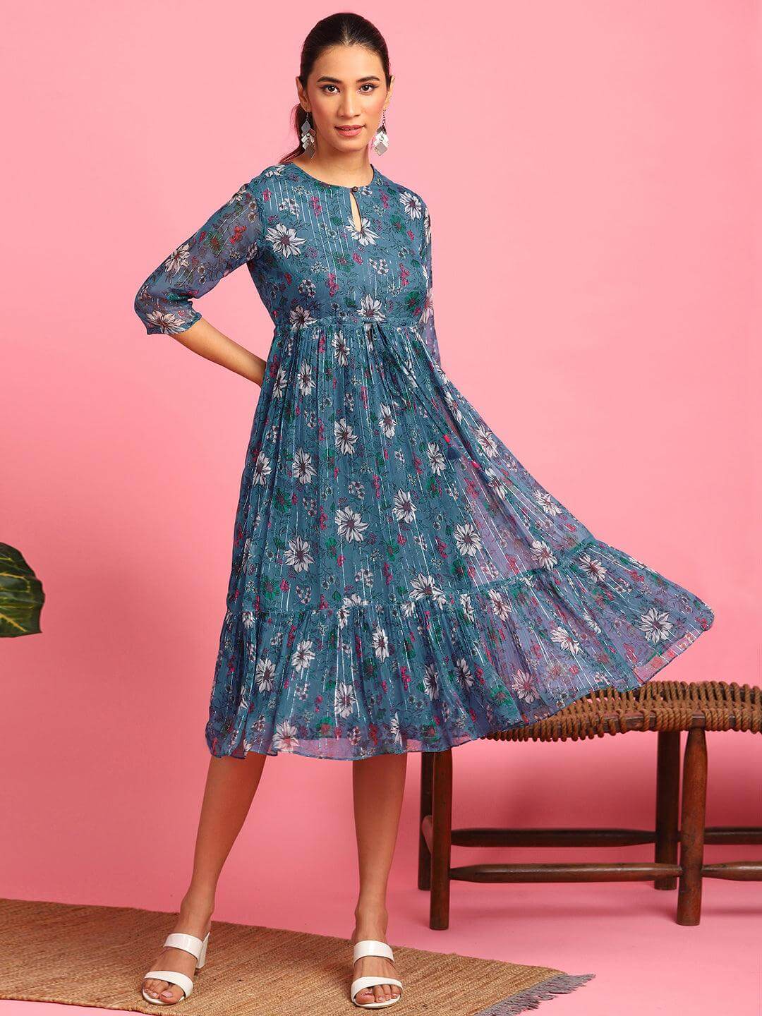 - Style:- Length: 41(inch) | Pattern: Floral | Occasion: Casual | Type: Flared | Sleeve Type: 3/4 Sleeve(Regular Sleeves) | Color: Blue