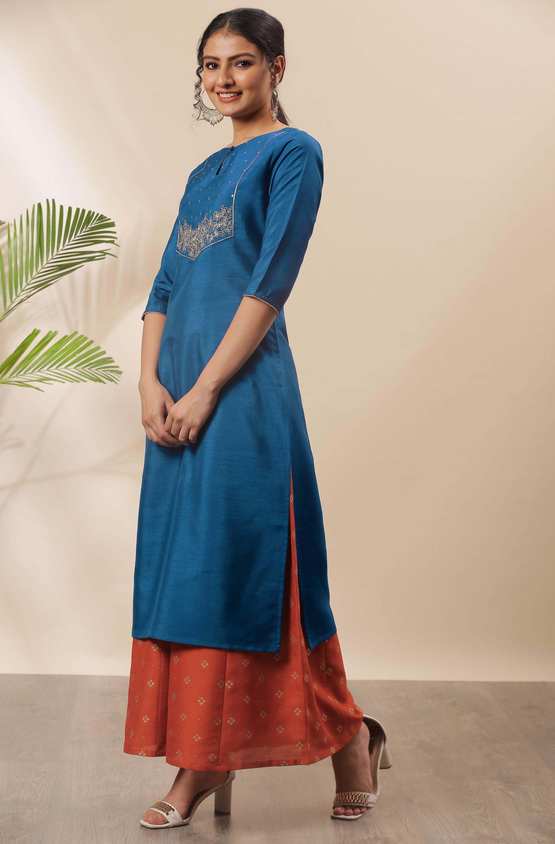 - Cruise through the world of fashion by wearing this blue 3/4th sleeve kurta from Janasya. This poly silk kurta has embroidery on yoke with keyhole neckline. The elegant straight style makes it a captivating choice. Style this with palazzo or pants with pumps to look trendy.
